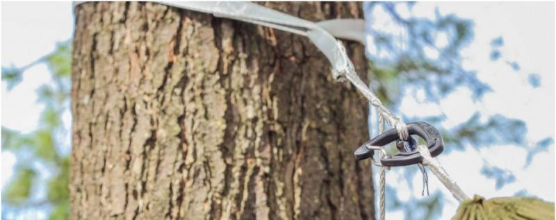 ヘリオスサスペンションシステムは 木に巻いて、カラビナでハンモックを繋げたら 好きな長さに調整するだけで簡単に設置できます。