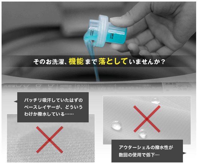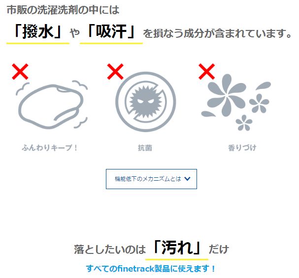 そこで、ファイントラックは独自に洗剤を開発し、撥水機能や吸汗機能を損なわずに汚れだけを落とす洗剤が誕生しました。