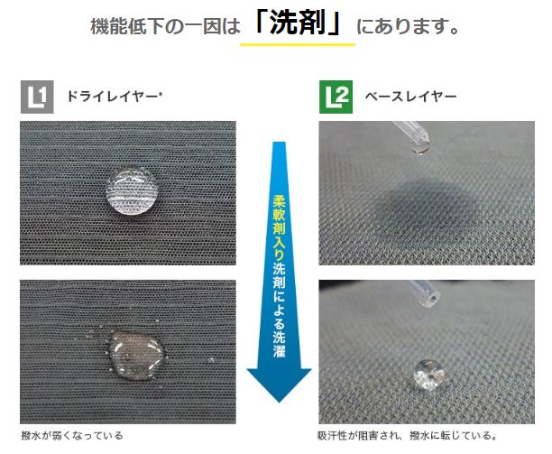 そして、含まれる成分により撥水機能や吸汗機能を損なってしまうものも多く存在します。